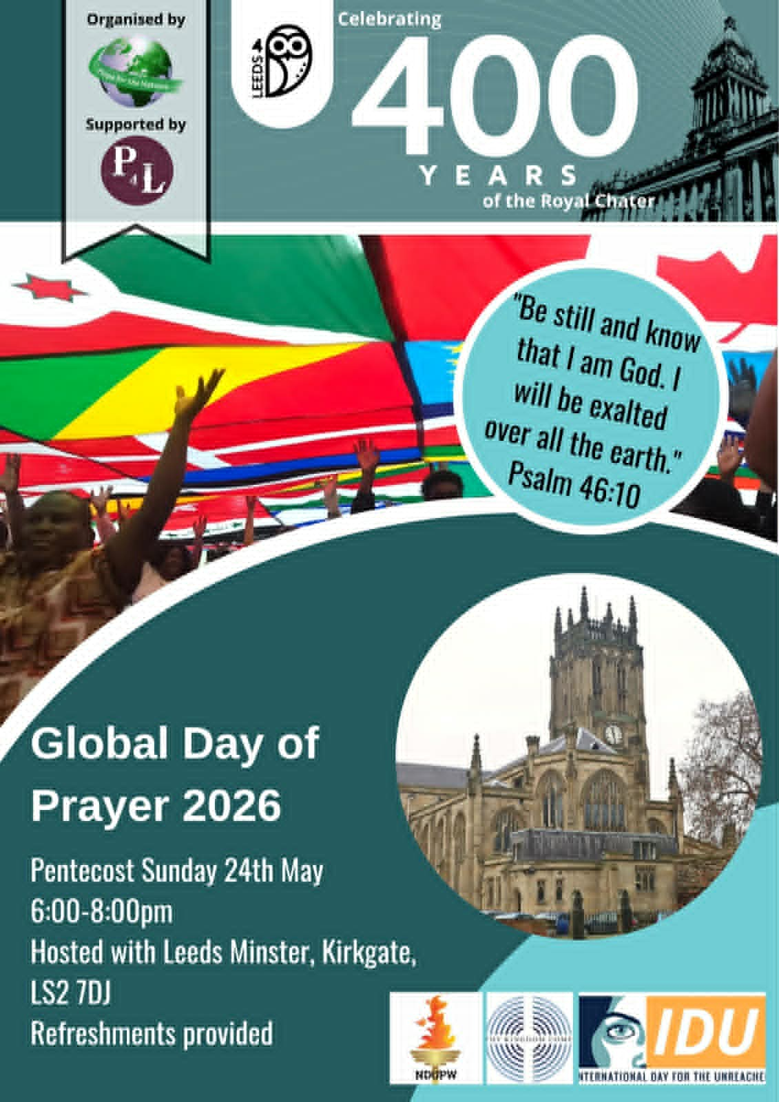The Global Day of Prayer 2026 will be hosted by Leeds Minster and will take place Pentecost Sunday 24th May, 6pm - 8pm focusing on prayer for the nations and celebrating our international diversity in Leeds.