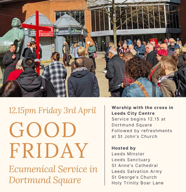 Worship with the cross in Leeds City Centre, beginning at 12.15pm at Dortmund Square on Friday 03 April.